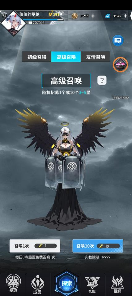 角色招募分为初级召唤、高级召唤和友情召唤。初级召唤及友情召唤有较小概率获取普通三系(天、地、人)和普通神魔五星英雄,高级召唤有较高概率获取普通三系(天、地、人)和普通神魔五星英雄,友情召唤需要冒险家添加好友并相互增送友情点后方可使用。